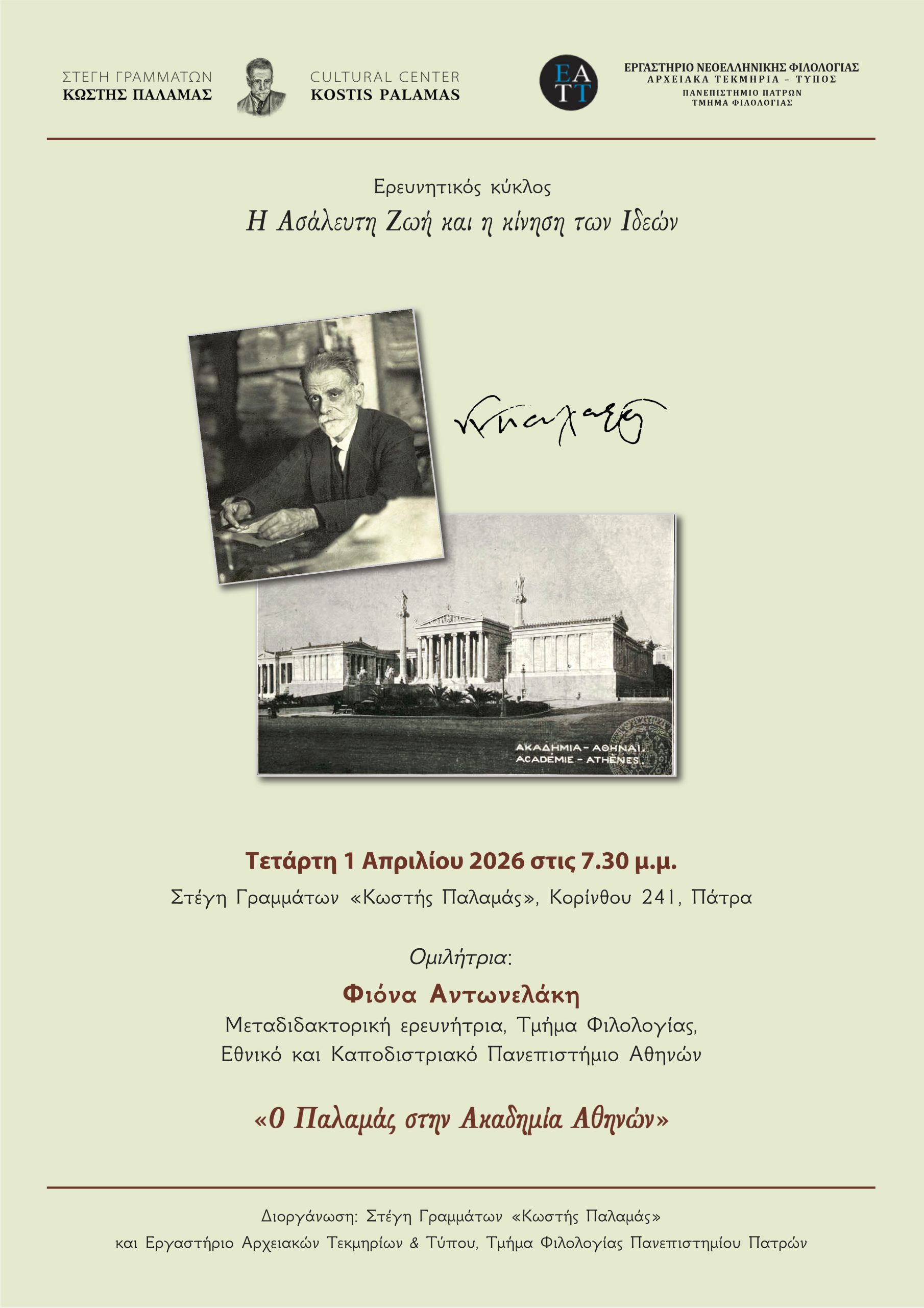 θα μας μιλήσει με θέμα: «Ο Παλαμάς στην Ακαδημία Αθηνών»