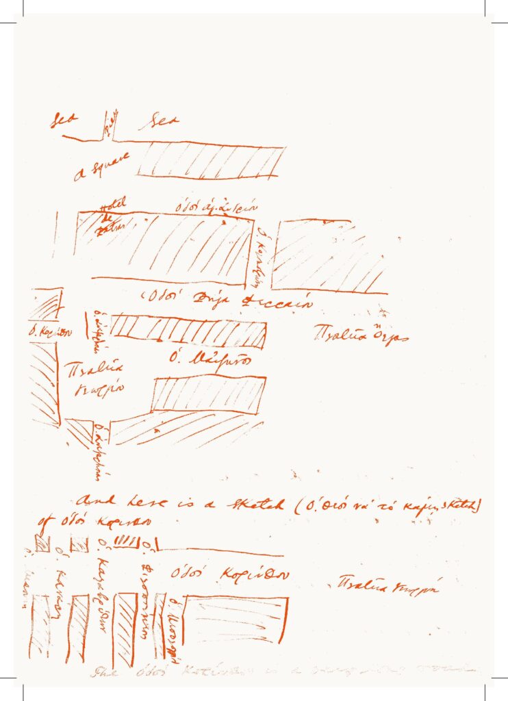Σχέδιο κάτοψης του κεντρικού τμήματος της πόλης της Πάτρας από τον Κ. Π. Καβάφη (καλοκαίρι 1901).